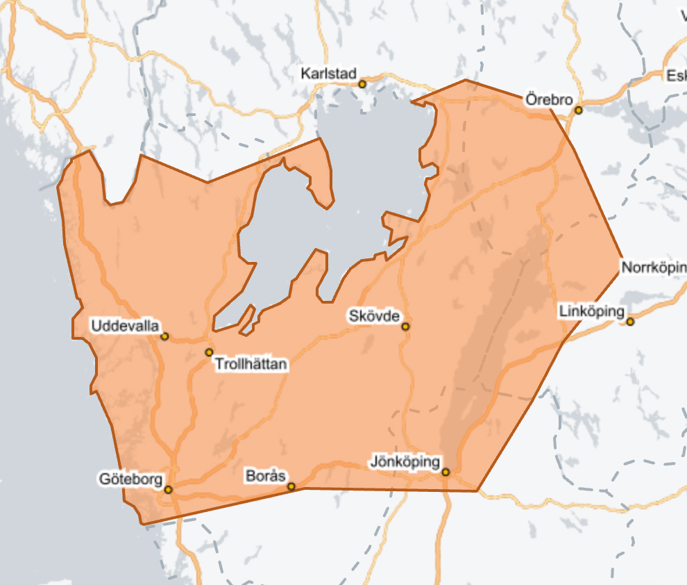 Söder om det oranga området är det en gul varning till strax norr om Värnamo.
