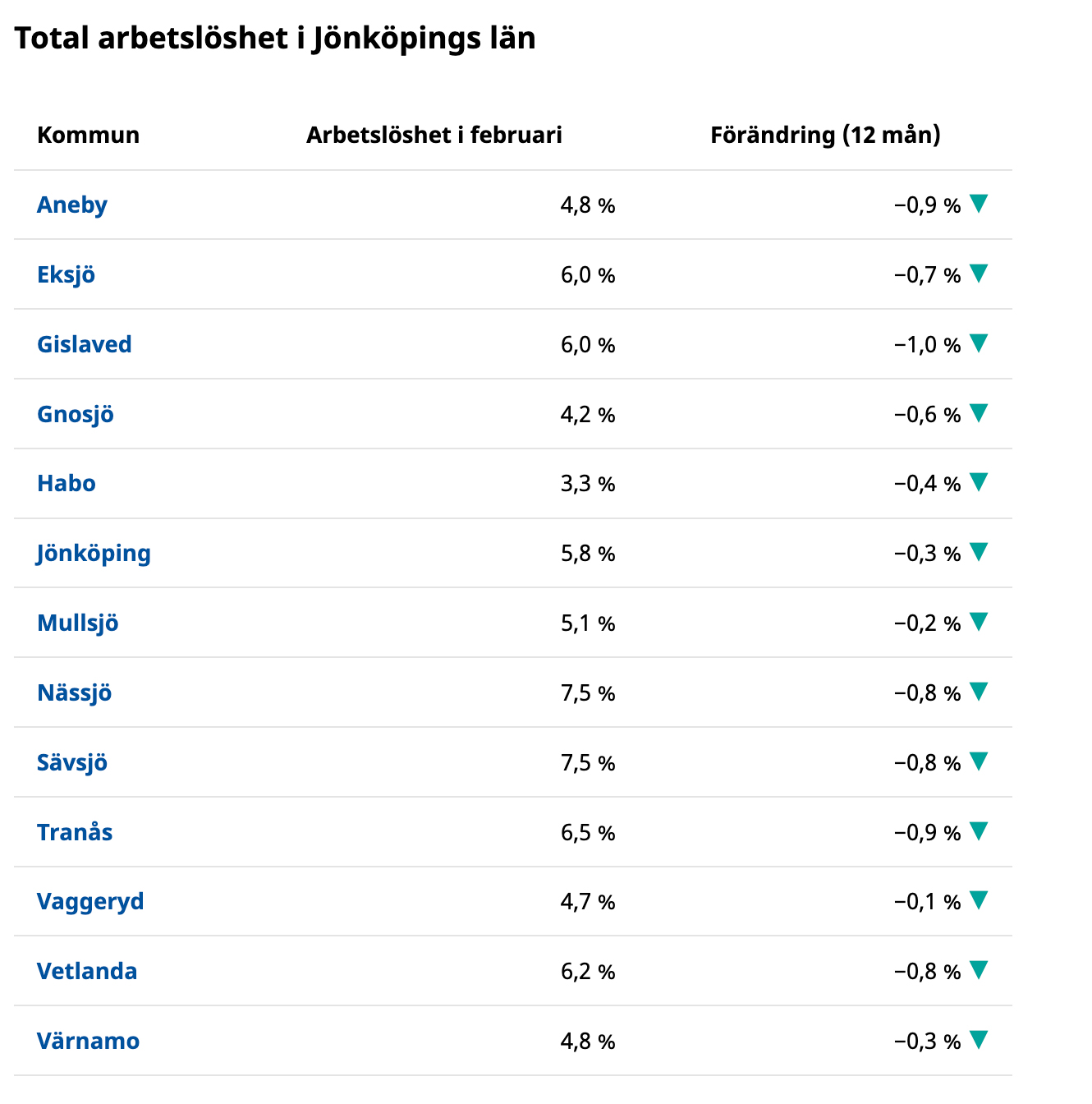 Värnamo är inte den enda kommunen i Jönköpings län där arbetslösheten går nedåt. Vi ser i själva verket just nu en nedgång i samtliga kommuner. Störst är minskningen i Gislaved, där arbetslösheten sjunker med 1,0 procentenheter.