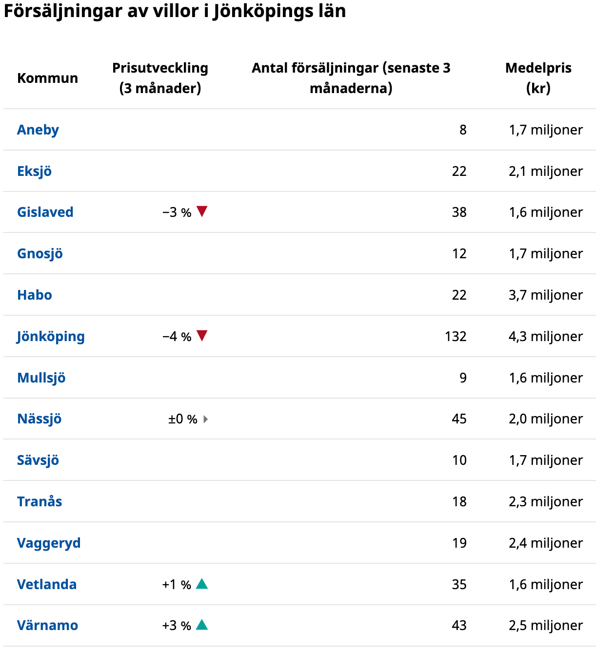 Även villapriserna har gått upp i Värnamo kommun. Medelpriset på försäljningarna under de senaste tre månaderna visar på en uppgång med 3 procent. I hela Jönköpings län sjunker däremot villapriserna. I hela länet noterades en prisnedgång på 1 procent. Bland kommunerna i Jönköpings län stiger priserna på villor i två av fem kommuner (där det redovisats uppgifter om prisutveckling). Störst var ökningen i Värnamo där priserna steg med 3 procent. I Jönköping däremot sjönk priserna med 4 procent. Notera att det på grund av få försäljningar saknas uppgifter om prisförändringar för villor i åtta av länets 13 kommuner.