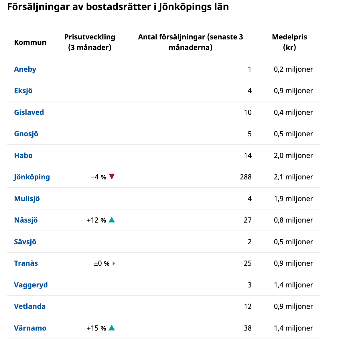 Bland kommunerna i Jönköpings län steg priserna på bostadsrätter i två av fyra kommuner (där det redovisats uppgifter om prisutveckling). Störst var ökningen i Värnamo där priserna steg med 15 procent. I Jönköping däremot sjönk priserna med 4 procent. Notera att det på grund av få försäljningar saknas uppgifter om prisförändringar för bostadsrätter i nio av länets 13 kommuner.