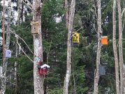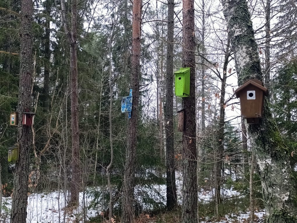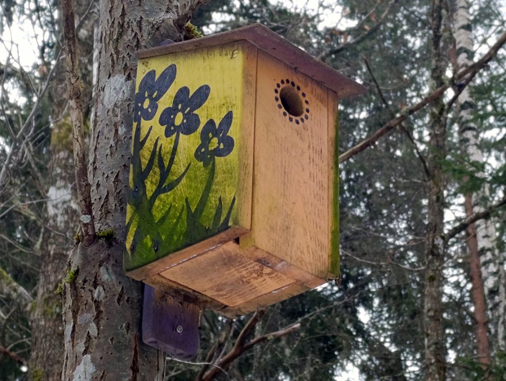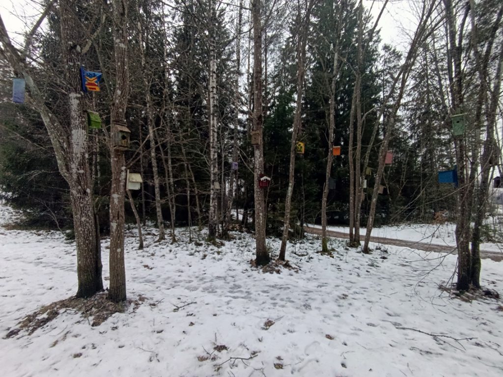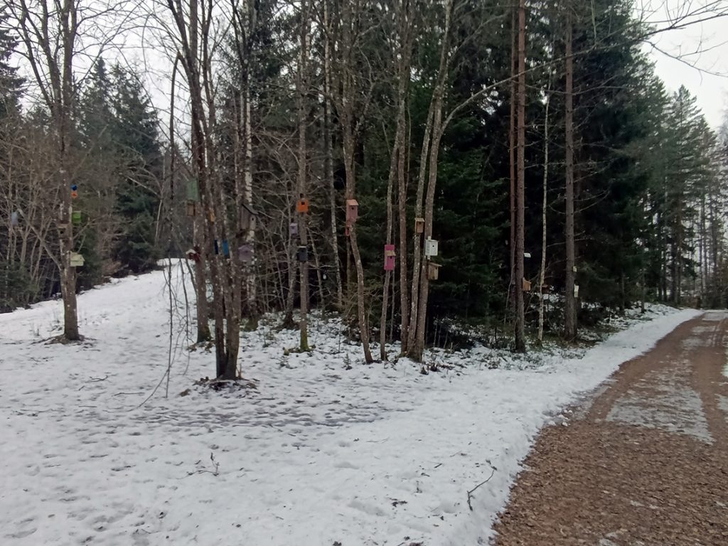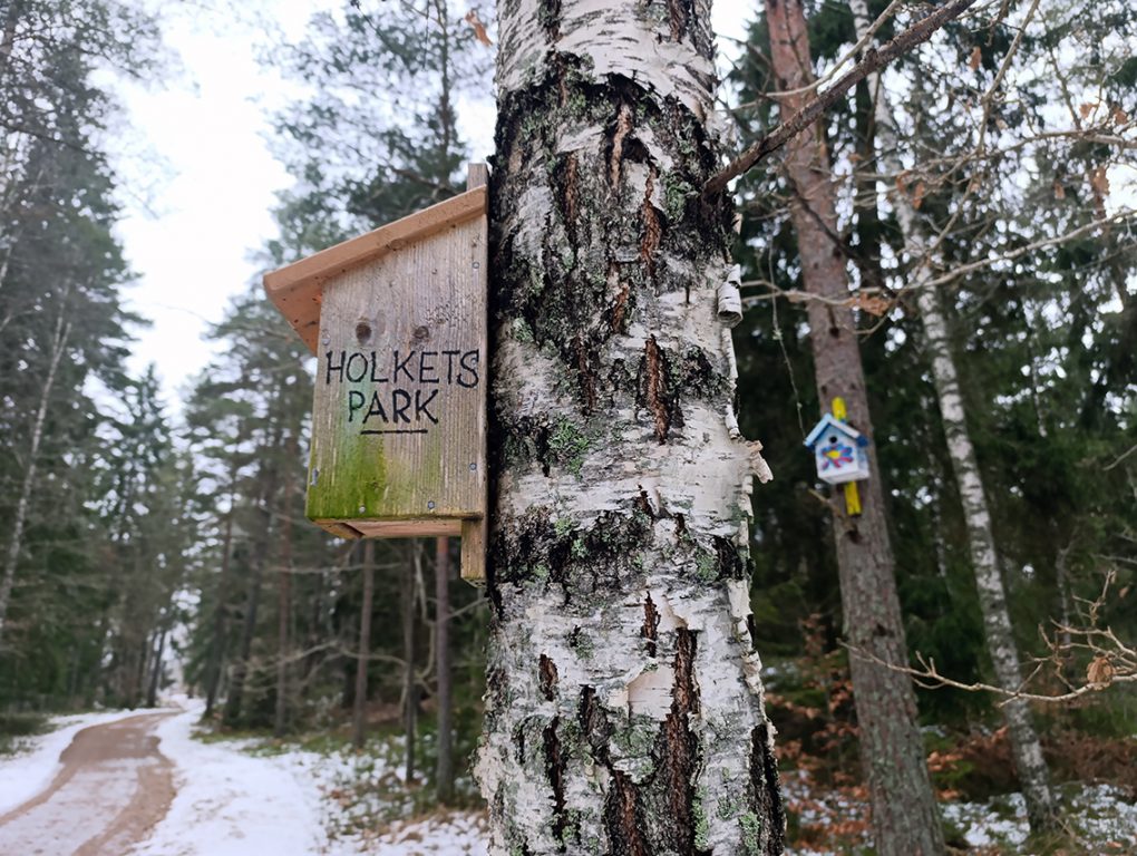 Jag satte med raska steg av mot ett av dagens delmål: Vråen. Efter att ha passerat Skogens förskola hamnade jag i stadsdelens elljusspår. Medans jag promenerade ner mot elljusspårets flacka delar hamnade jag i en skogsdunge. Plötsligt får jag syn på något färgstarkt i träden: en fågelholk. Jag spänner ögonen ytterligare och ser den ena fågelholken efter den andra. En oas av färgstarka fågelholkar uppenbarar sig för min blick. Jag hade hamnat i Holkets park: ett konstnärligt busprojekt som enligt uppgifter ska väcka människors nyfikenhet och ska liva upp stämningen i elljusspåret. Har du inte sett Holkets park tidigare så kan jag varmt rekommendera ett besök där.