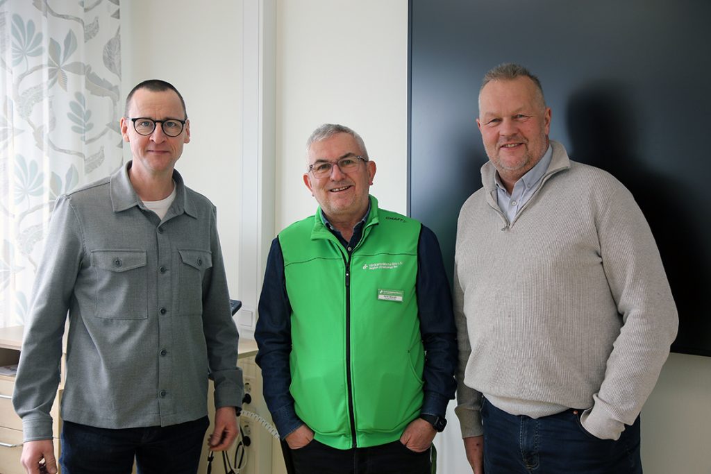 Solen tittar fram mellan molnen. Otursdagen till trots är glädjen lika stor innanför vårdcentralens entrédörrar när Raymond Pettersson, Ulf Hindsén och Göran Pettersson tas emot av verksamhetschefen Haris Sibonjic.
