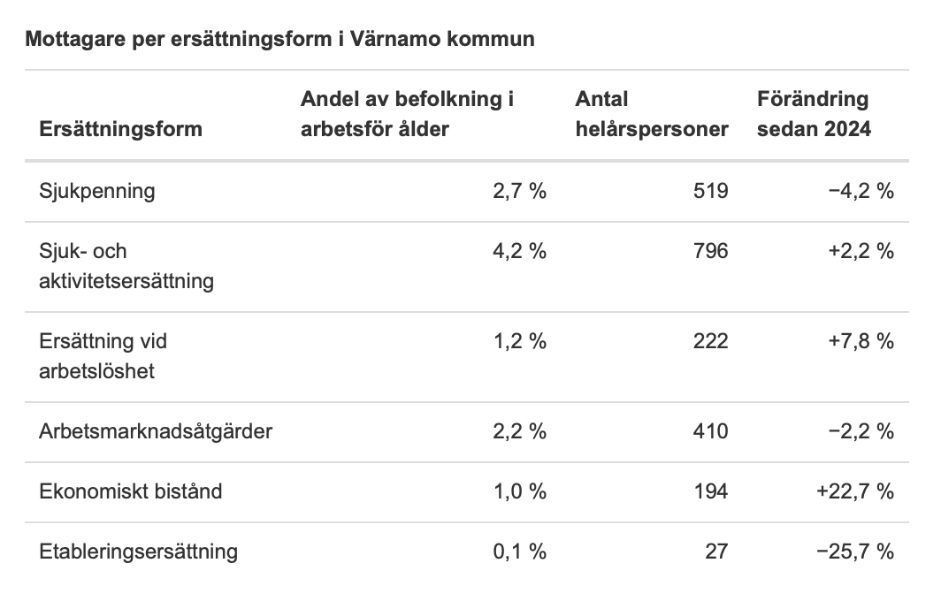 När det gäller sjukpenning minskade istället antalet så kallade försörjda helårspersoner i Sverige. Det var trenden även i Värnamo, där antalet som försörjs av sjukpenning minskade med 4,2 procent, till motsvarande 519 personer.
