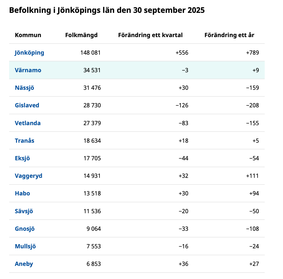 Den 30 september bodde 34 531 personer i Värnamo kommun, enligt SCB:s senaste siffror. Det är något färre än i slutet av andra kvartalet, men skillnaden är så liten att den lika gärna kan bero på den lilla justering som SCB gör av siffrorna för att skydda enskilda individers identitet.