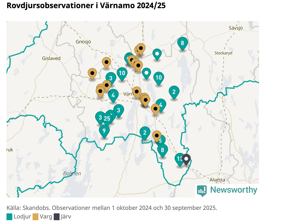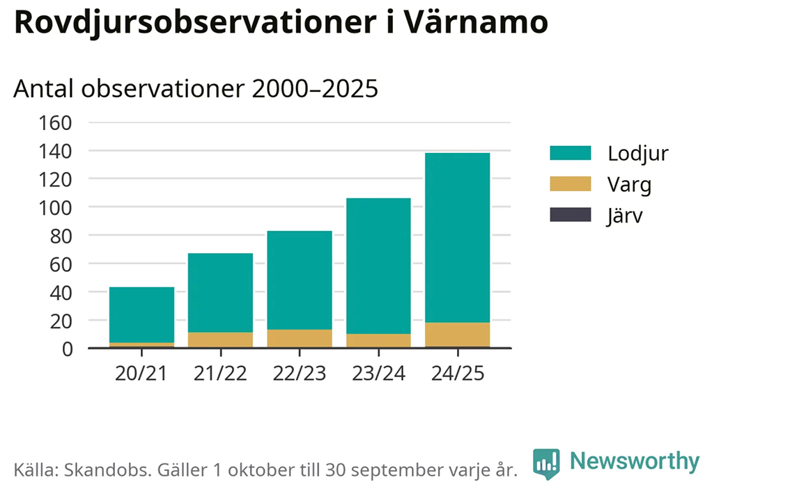 Där kan vem som helst rapportera sina observationer av de stora rovdjuren björn, varg, lodjur och järv. Mellan 1 oktober 2024 och 30 september i år har knappt 10 000 observationer registrerats i landet. Det kan vara synobservationer, foton, spår, spillning, döda bytesdjur eller andra tecken på rovdjursförekomst. I Värnamo handlar det om totalt 138 observationer av lodjur, varg eller järv.
