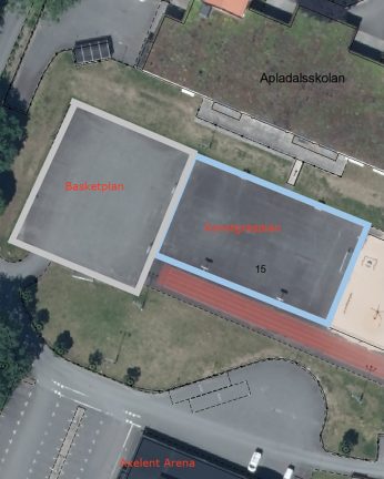 Teknik- och fritidsförvaltningen föreslår att ytan framför Apladalsskolan som i dag används som basketplan blir konstgräsplan och att parkeringsytan, som tidigare har varit en basketplan, återigen blir en basketplan. Bild: Värnamo kommun