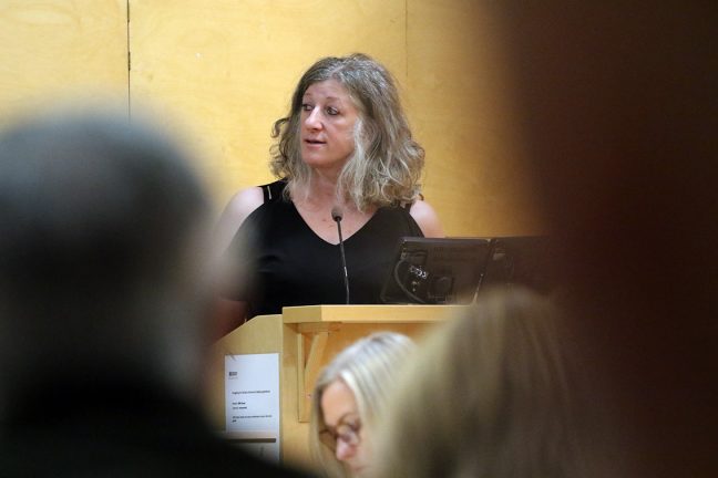 Maria Johansson (-) berättar om barn- och utbildningsnämndens språkarbete.