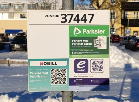 Bild över uppdaterade skylten över de olika parkeringsapparna vid parkeringarna vid Pinnstolsgatan (Bakom Tre Liljor). Bild: David Alin