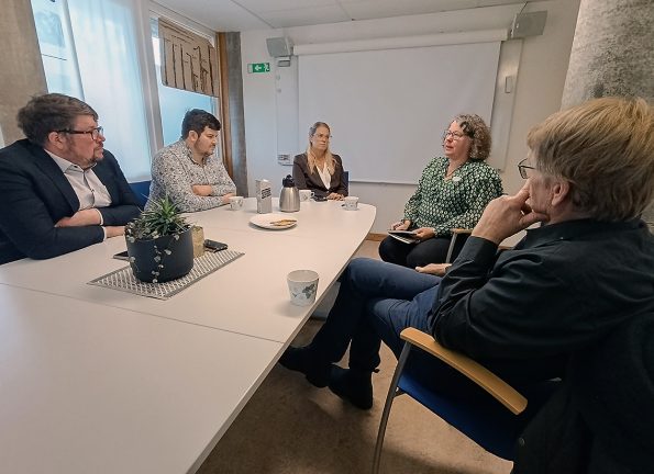 Johan Hilding, Axel Hilding, Johanna Lindbergh, Helene Wedell och Stefan Widerberg samtalar om Gröndalsskolans verksamhet. Bild: David Alin
