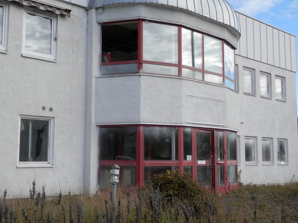 En stor, tidigare snygg och i mina ögon högklassig fabrikskontorslokal, har trots stängda dörrar och fönster under en längre tid utsatts för en förödande förstörelse. Allt som gått att slå sönder in- och utvändigt har mött detta öde.