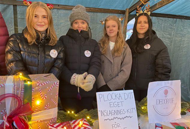 Tova Magnusson, Tyra Wester, Evelina Aronsson och Michelle Aya-Borrero i Decor UF säljer kit för presentinslagning. Bild från Vaggeryds julskyltning: Jenny Almlöf