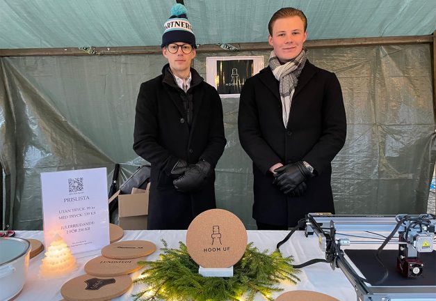 Hugo Lagö och Melker Sandahl driver UF företaget Hoom UF tillsammans med Otto Berg och Otto Sandahl. Bild från Vaggeryds julskyltning: Jenny Almlöf