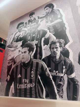 Hela trappan var dekorerad med bilder på några av de klubbens mest framgångsrika spelare genom tiderna. Bland andra den elegante brassen Kaká och sen holländske målsprutan Marco Van Basten som syns i förgrunden, men mina egna ögon drogs till mittenfiguren: Paolo ”Il Capitano” Maldini.