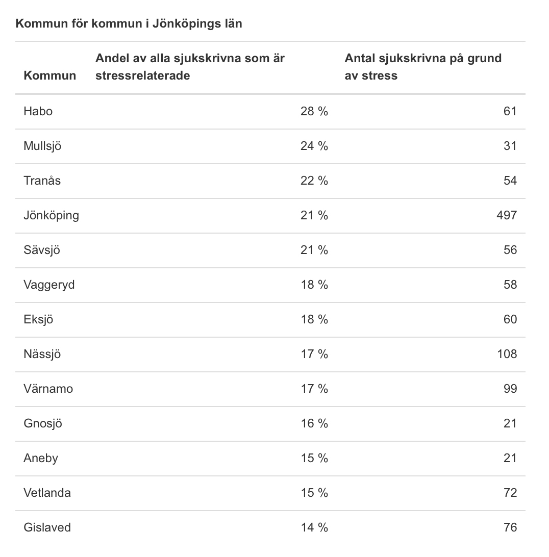 Bland kommunerna i länet har Habo högst och Gislaved lägst andel stressrelaterade sjukskrivningar (se tabell längre ner).