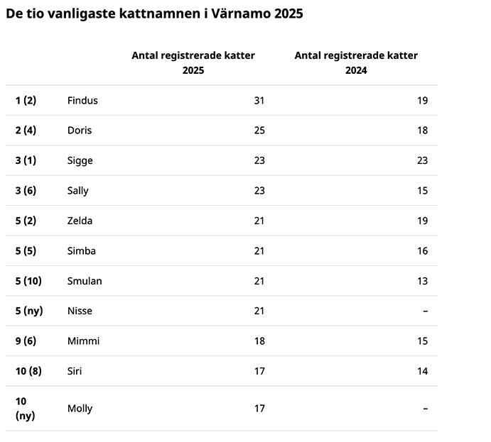 Findus tar över förstaplatsen på listan över de vanligaste kattnamnen i Värnamo. Den 31 december 2025 fanns det 31 katter som lystrade till det namnet i kommunen. Tidigare toppnamnet Sigge ligger nu på plats tre. Det visar Jordbruksverkets senaste statistik.