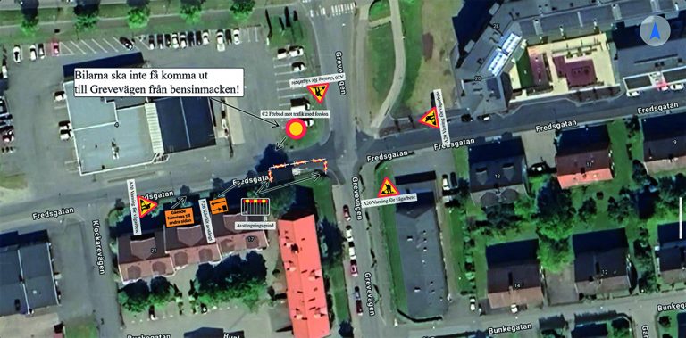 Under tiden som arbetet pågår stängs det berörda arbetsområdet av med grindar och varningsskyltar sätts ut vid både Fredsgatan och Grevevägen. För att höja säkerheten i samband med arbetet införs ett temporärt förbud mot trafik med fordon från bensinmacken ut på Grevevägen. ”Bilarna ska inte få komma ut till Grevevägen från bensinmacken!”, står det tydligt beskrivet i bilden.