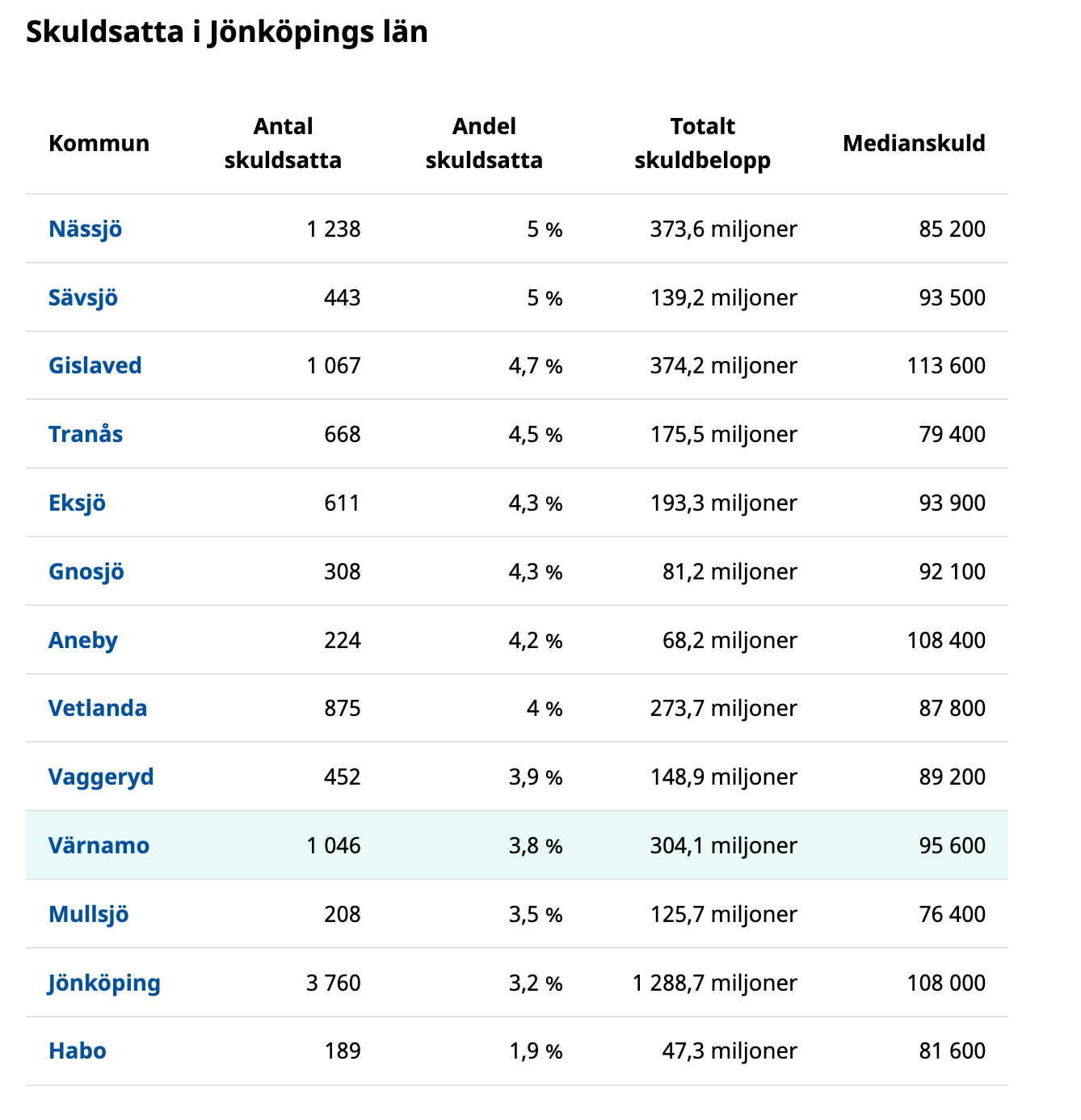 Vid årskiftet var 4 procent av alla Värnamobor över 18 år registrerade hos Kronofogden. Störst andel skuldsatta i länet finns i Nässjö (5 procent), medan den lägsta andelen finns i Habo (2 procent).