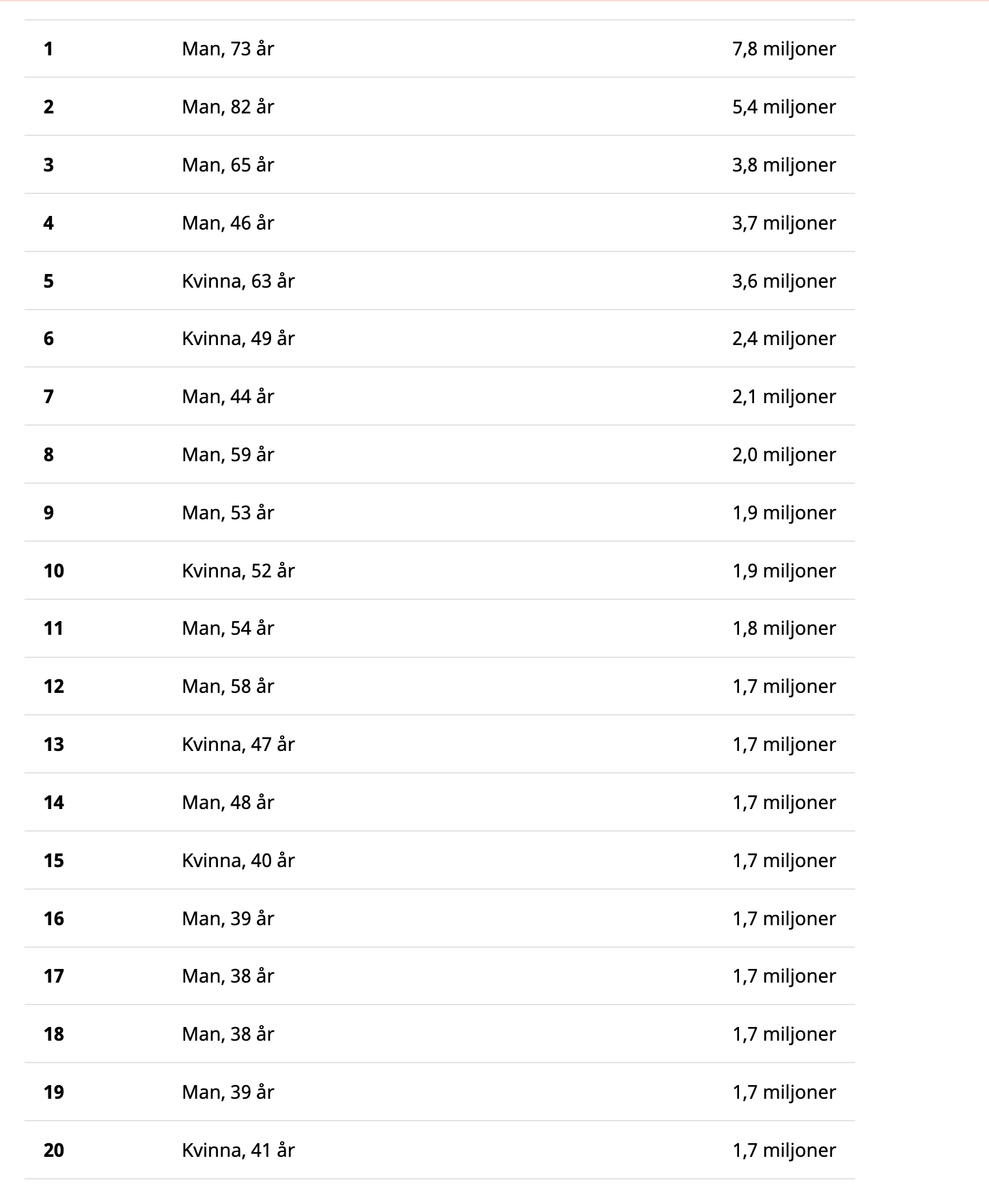 Den typiska Värnamobon som hamnat hos Kronofogden hade en skuld på omkring omkring 96 000 kronor, men skuldberget är ojämnt fördelat. Newsworthy har begärt ut listan över de 20 mest skuldsatta privatpersonerna i kommunen, och deras totala skuld var vid årsskiftet 52 miljoner kronor. Den allra största skulden står en 73-årig man för, vid årsskiftet var han skyldig Kronofogden 7,8 miljoner. Det är ändå en förhållandevis liten skuld om vi jämför med de mest skuldsatta personerna i andra kommuner.