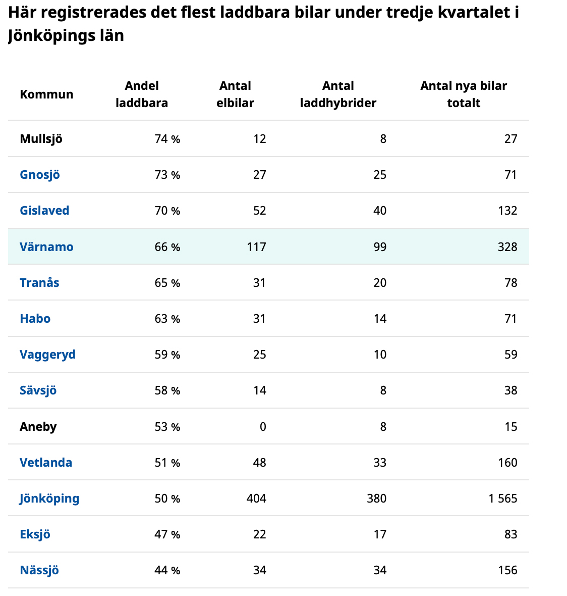 Under tredje kvartalet 2025 var 66 procent av alla nyregistrerade personbilar i Värnamo laddbara (sammanlagt registrerades 328 nya bilar). Merparten av de laddbara bilarna var rena elbilar (36 procent av alla).