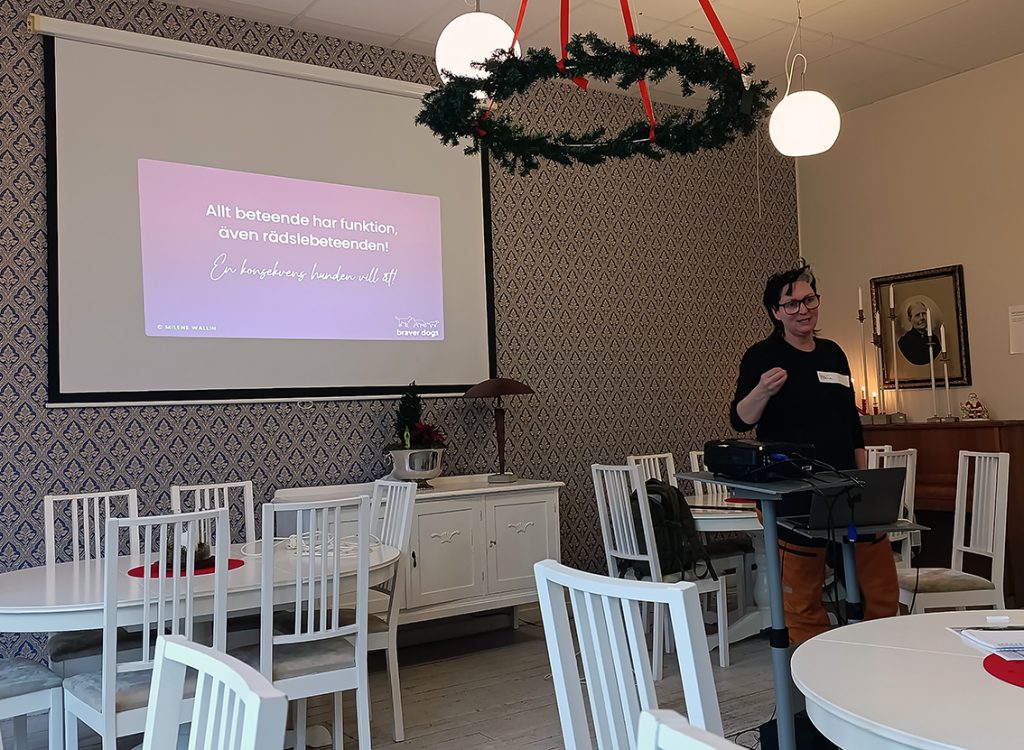 Milene Wallin är en certifierad beteendeutredare som jobbar med utredning av komplex beteendeproblematik. Hon har specialistkunskap inom rädsla, separationsproblem, stress och panikproblematik och i samarbete med Hundtrixet föreläste hon om hundrädsla på Dannäs Våffelcafé.