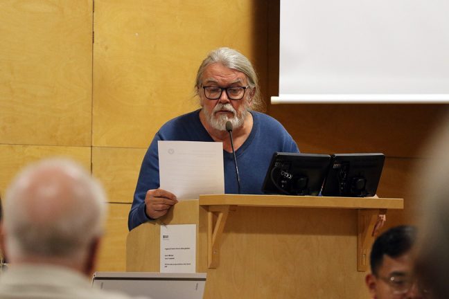 Fjodor Eklund (V) läser upp frågan. Bild: David Alin