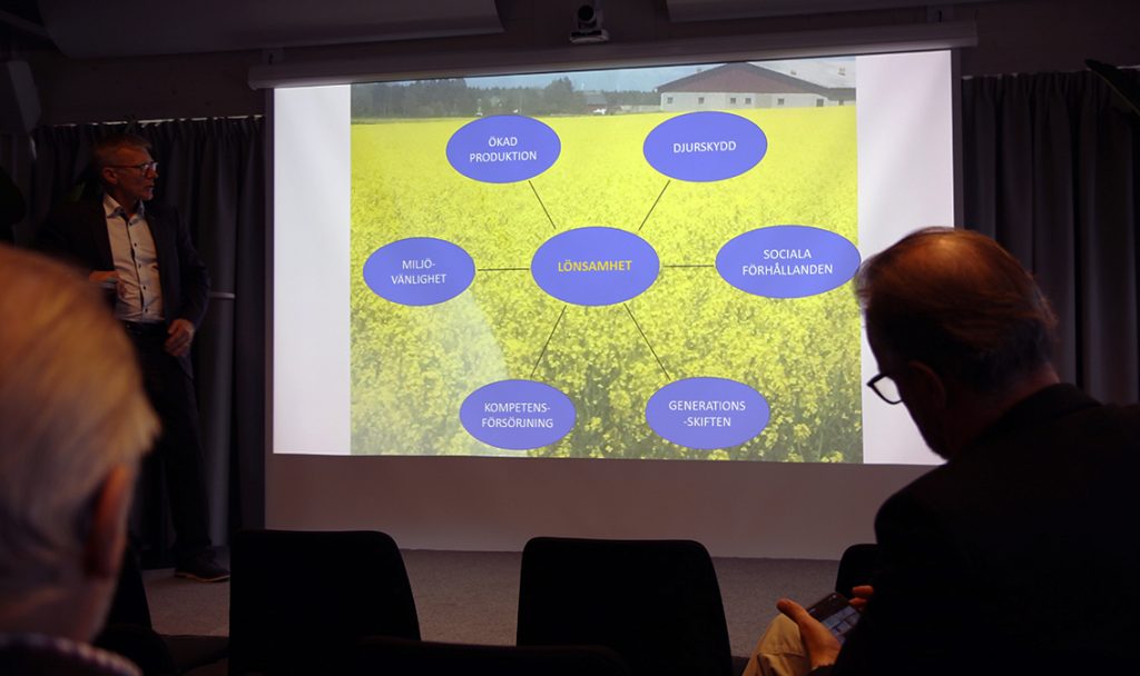 Vad påverkar lantbrukens lönsamhet? Där finns en uppsjö av så stabila faktorer. På minussidan nämner Staffan Eklöv högre skatter, högre krav för djurskydd, låg betalningsvilja för svenska mervärden vid upphandling och på restaurang, större regelbörda och lägre produktivitet. På plussidan nämnds välutbildade och drivna lantbrukare, att det svenska jordbruket är tekniskt avancerat, har mindre skadegöraravtryck och är miljövänligt och att Sverige har ett gott djurskydd.