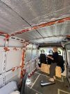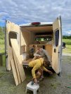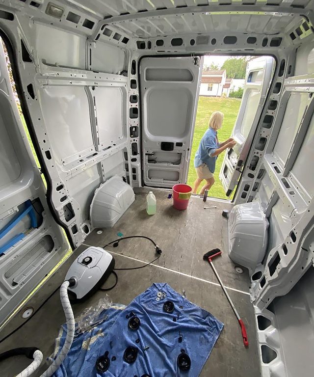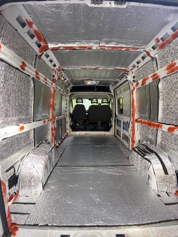 – Det första steget var att rensa ur bilen och ta bort mellanväggen fram till hytten. Jag ville få in mer ljusinsläpp från frontsidan, så därför valde jag att göra detta. Sedan valde jag att behålla golvet. Jag tänkte ta bort det först, men det var både bultat och limmat så det blev nästan ett större jobb och hade gjort mer förstörelse att få bort det än att bara behålla det. Under tiden det här pågick så beställde jag isoleringen som kom i juni månad. Mellanperioden ägnades åt grovstädning och lite rostarbete. Jag isolerade bilen med 19 millimeter tjock cellgummi-isolering och fick hjälp av en glasfirma att sätta in fönster vid bakdörrarna och i sidofönstret. Dels för ljusinsläpp men vi valde också som en säkerhetsaspekt att sätta in tonade rutor. Under tiden som det arbetet pågick beställde jag takfläkt, kök, kylskåp, spis och toalett och gjorde en kartläggning av material jag skulle använda till inredningen, berättar hon.