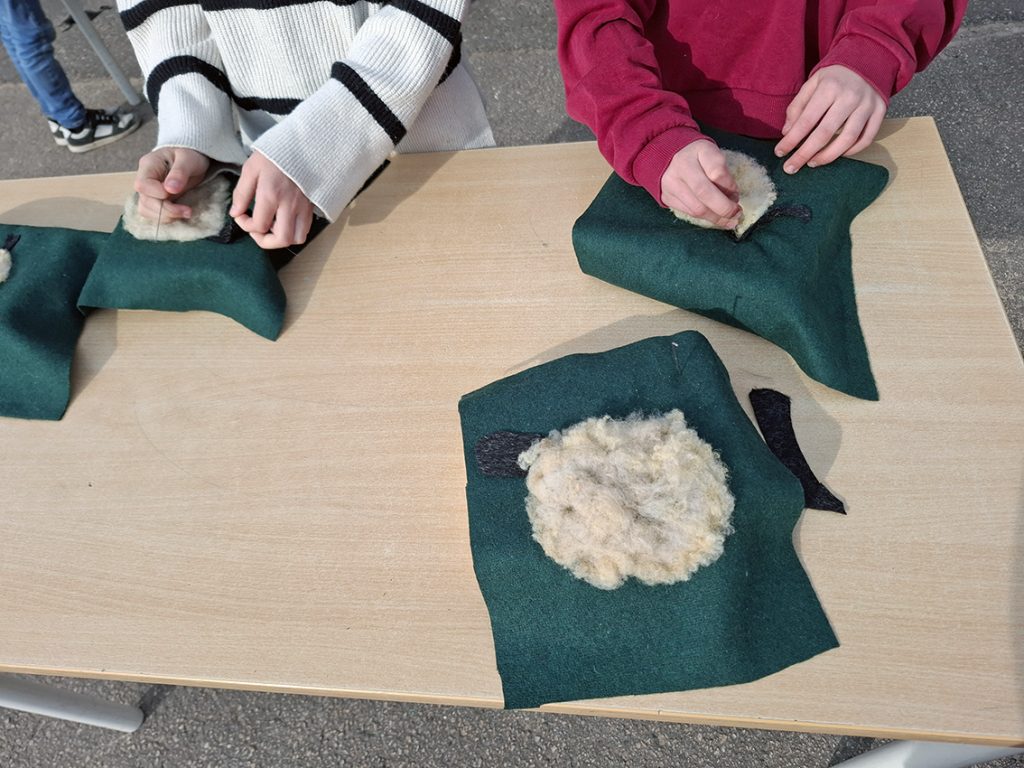 – En familj som har barn på skolan gav oss en säck med ull så vi fick testa på att karda och Tova. Resultatet blev får som är nåltovade. Treorna gjorde lamm och årskurs 4 skapade ett får i naturlig storlek. Några fiskeintresserade killar började med att göra en gädda. Därifrån spann de vidare på att de ville ha en gubbe som satt och metade. Så högt upp i en lind vid SJ-området sitter en gubbe i naturlig storlek med ett metspö i handen och fiskar. En gammal cykel har prytts med diverse tyg, band med mera och fått namnet ”gamle Bettan”.
