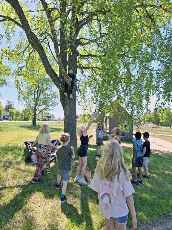 – Det är en utställning med elevernas olika alster som går utmed gångbanan, in på Björkvägen och sedan på det så kallade SJ-området mitt i byn. Det är konstverk som elever på hela skolan har varit med och skapat. F–2 har varit kreativa under de stunder de har haft PA och som rastaktiviteter. Årskurs 3–6 har skapat då de har haft slöjd. Så gott som alla har gjort fiskar som simmar längs staketet utmed gångbanan. Man har själv designat sin fisk. En del har pyntats med pärlor andra med FC Barcelonas logga.