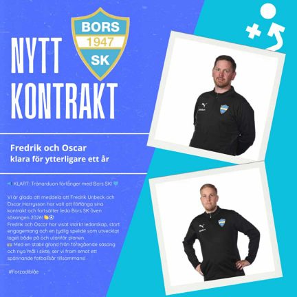 Fotboll Fredrik Unbeck och Oscar Harrysson fortsätter som tränare i Bors SK. Det meddelar klubben i dag.