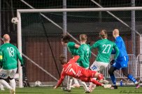 På en passning centralt så vänder han upp elegant med en touch och avslutar mot vänster stolpe där målvakten ligger raklång och lyckas få fingerspetsen på bollen och styr den till hörna.