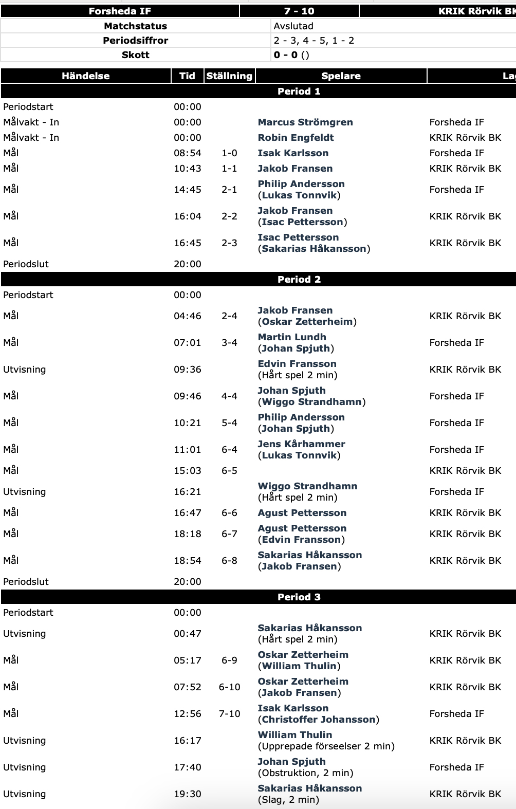 Forsheda ledde i mittperioden med 6–4 men gästerna gjorde därpå sex raka mål innan det blev en reducering till slutresultatet 7–10.