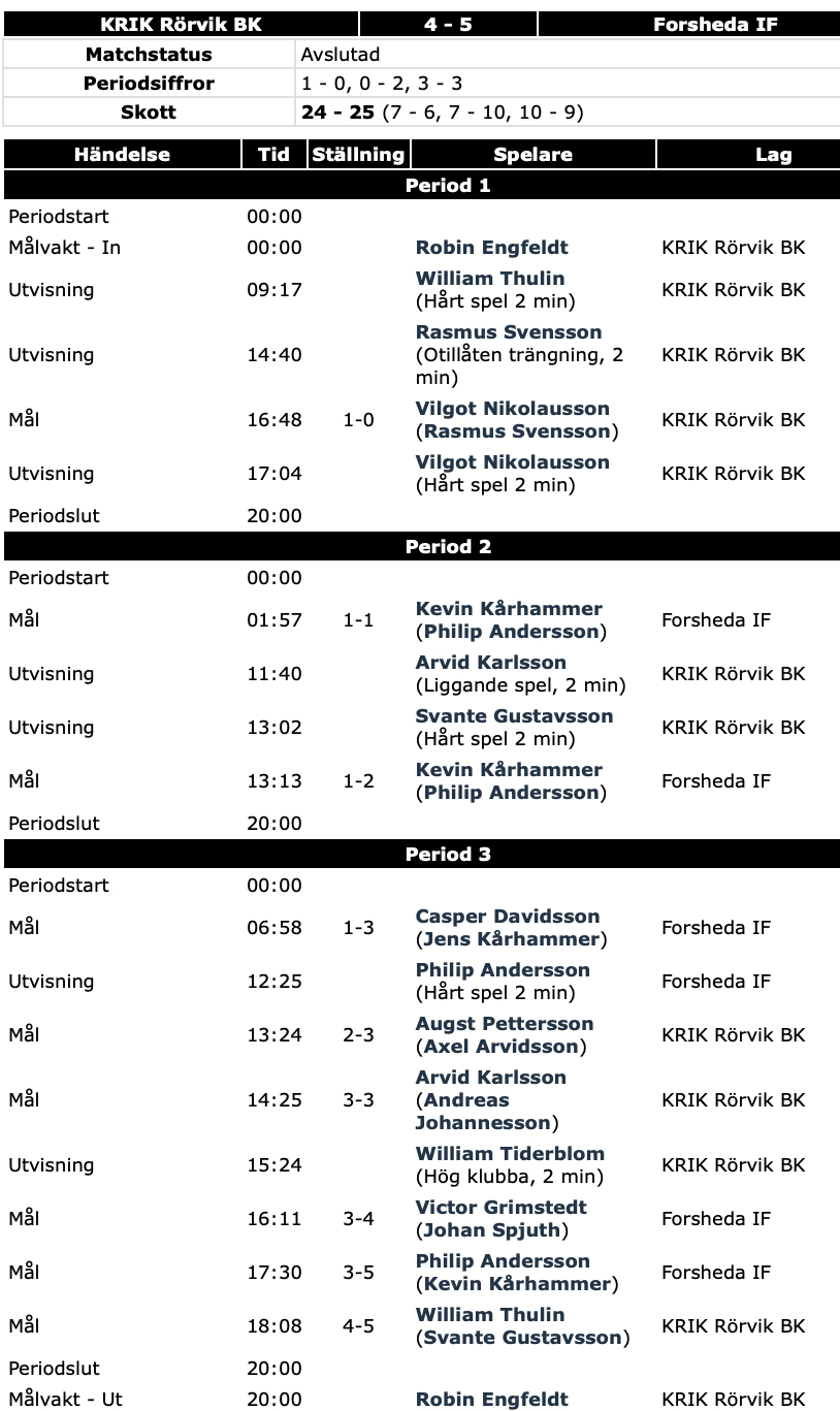 Efter att hemmalaget haft ledningen när lagen gick till periodpaus så kom Forsheda ut och vände på steken i den andra perioden efter dubbla mål av Kevin Kårhammer.