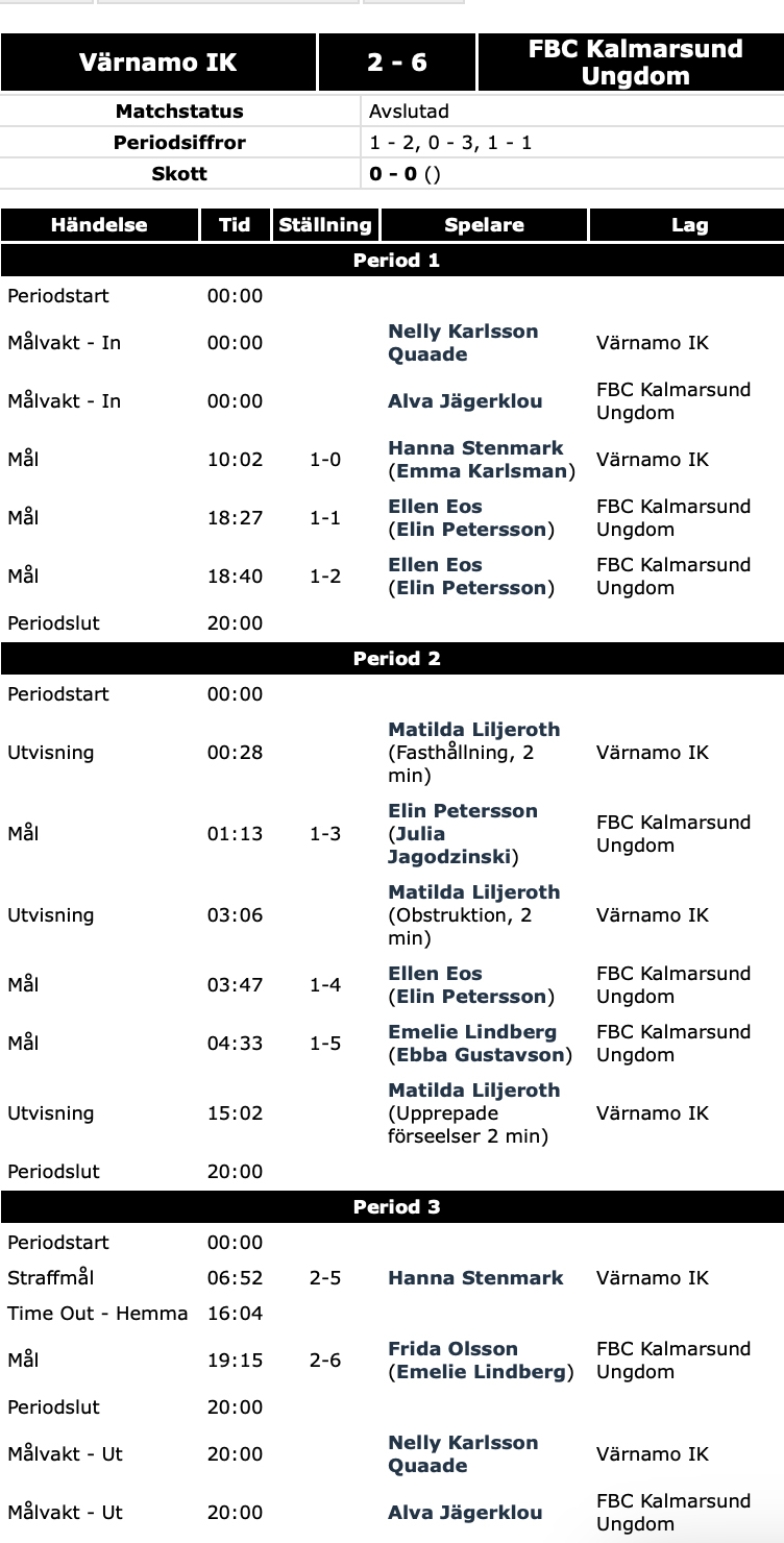 Innebandy Värnamo IK förlorade hemmamötet med Kalmarsund Ungdom med 2–6. Uppdaterat.