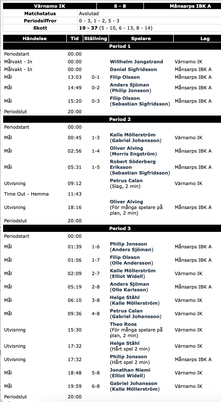 Till slut blev det 8–6 till Månsarp. VIK får glädja sig åt att man i alla fall snyggade till förlustsiffrorna när man reducerade från 2–8 till 6–8.