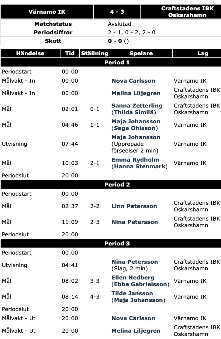 Det blev en värdefull fullpoängare för Värnamo so gjorde avgörande 4–3 i slutperioden,. Det var Skillingarydstjejen Tilde Jansson som höll sig fram efter framspelning av Maja Johansson.