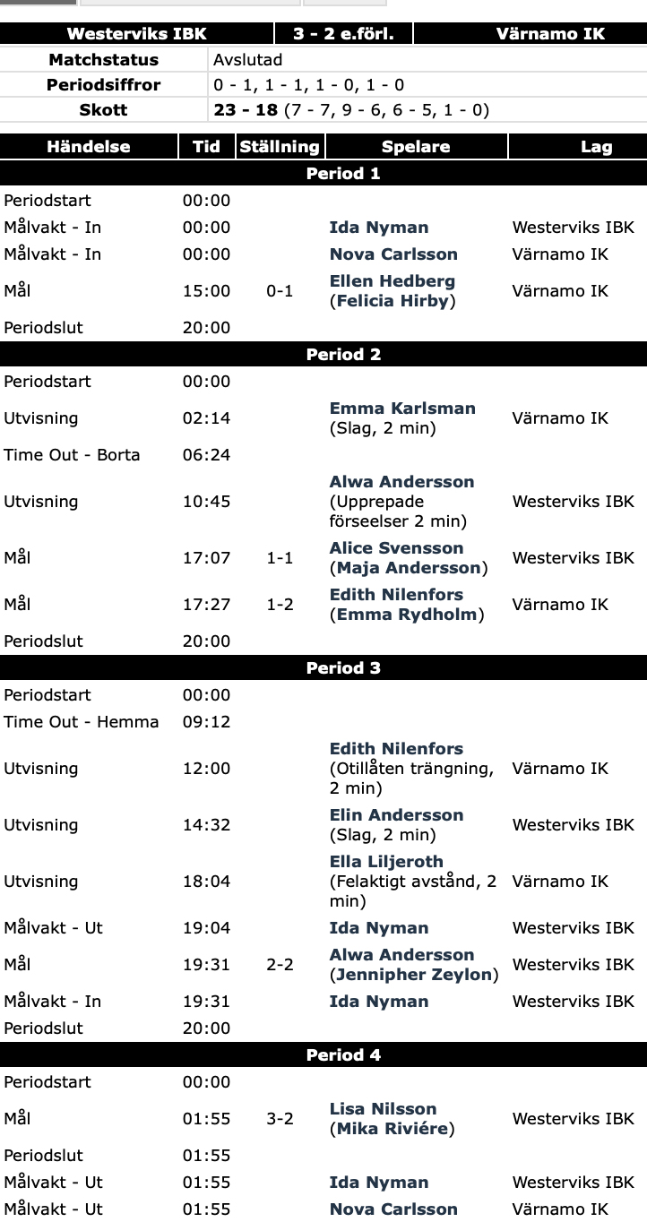 Värnamo hade 2–1 men med 29 sekunder kvar av den tredje perioden kvitterade hemmalaget i numerärt överläge och i förlängningen kom även 3–2,