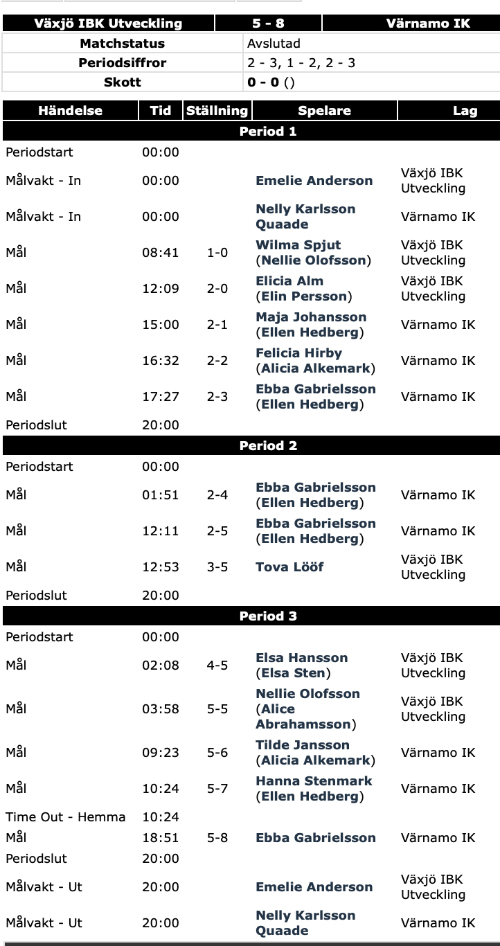 Värnamo hamnade i ett underläge med 0–2 men lyckades vända tillö pausledning med 3–2. I den andra perioden såg det bra ut och man gick till den sist pausvilan med ledning 5–3. Hemmalaget gjorde två snabba mål i den tredje perioden men vid 5–5 kom så lite föreläsande 6–5 genom Tilde Jansson, Sedan rann det iväg til len ganska klar seger.