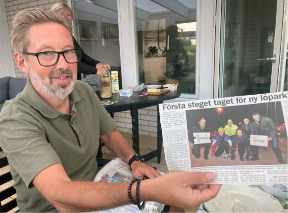 Bild på Apladalens Löparklubbs tidigare ordförande Micael Lindqvist med den första artikeln som skrevs om klubben. Bild: Apladalens Löparklubb