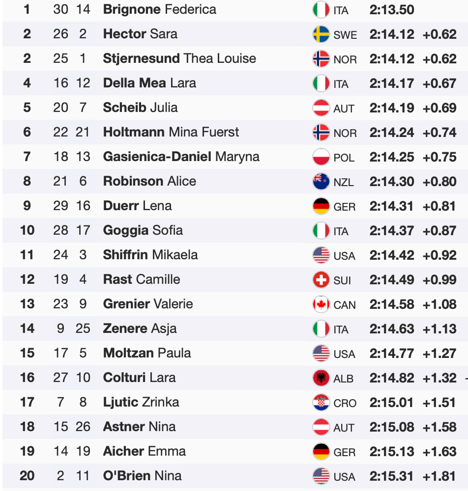 Segern gick till italienskan Brignone. Sara delade silvret med norskan Stjernesund.